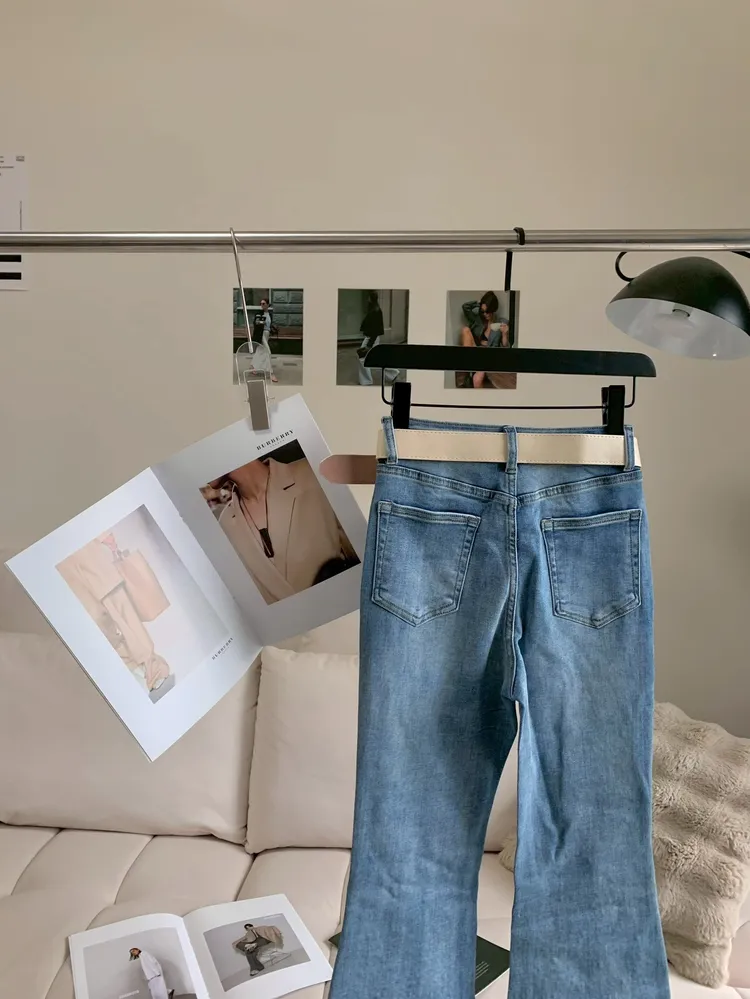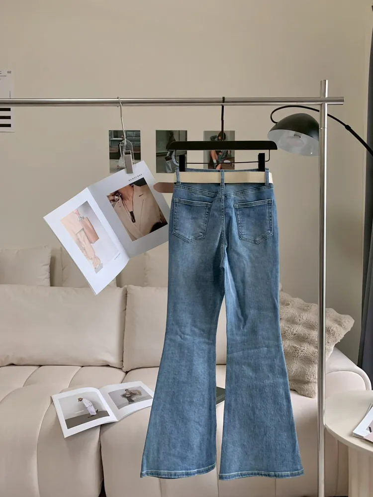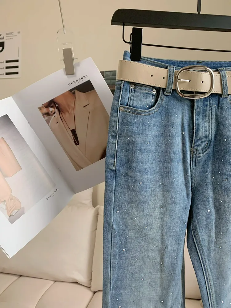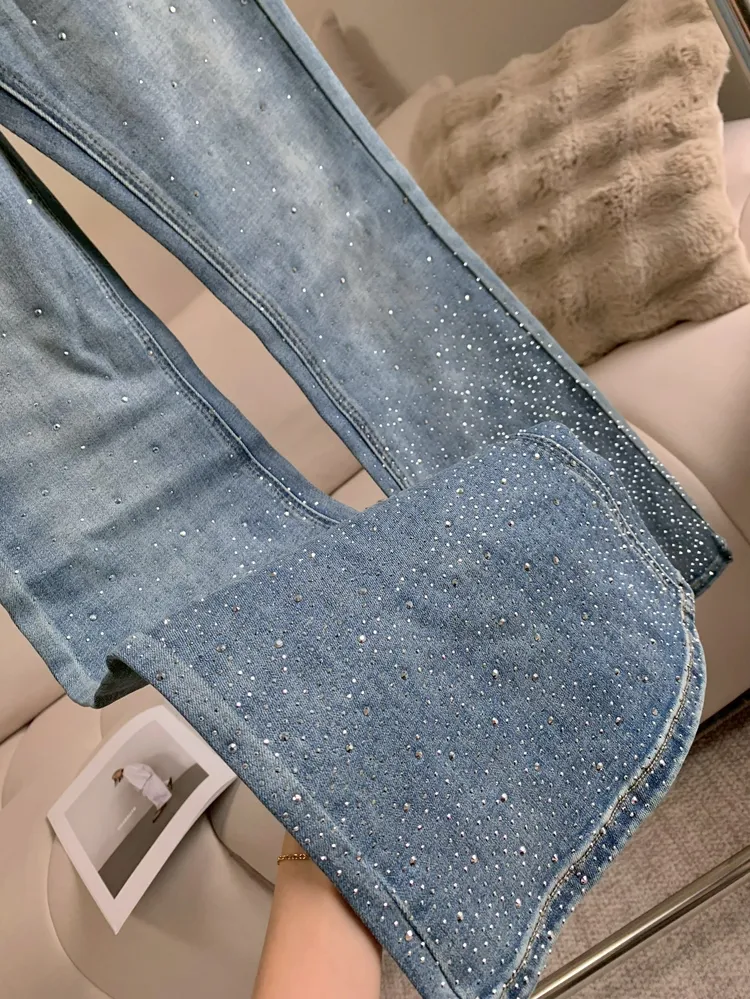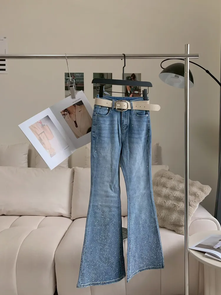 C107腰帶漸層閃鑽修身喇叭牛仔褲