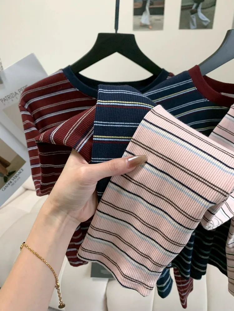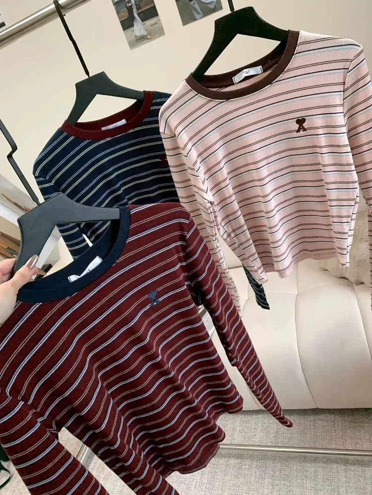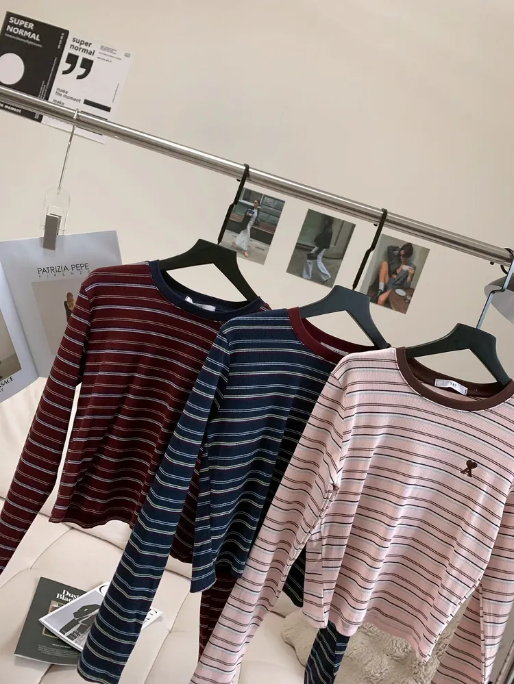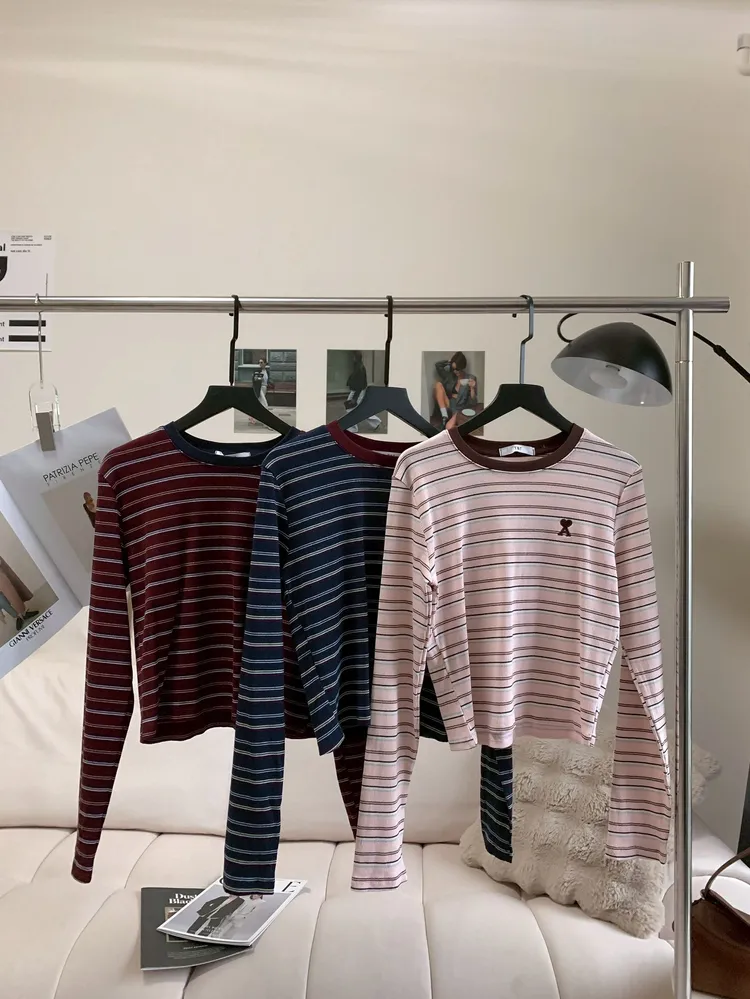 C139圓領刺繡撞色條紋上衣