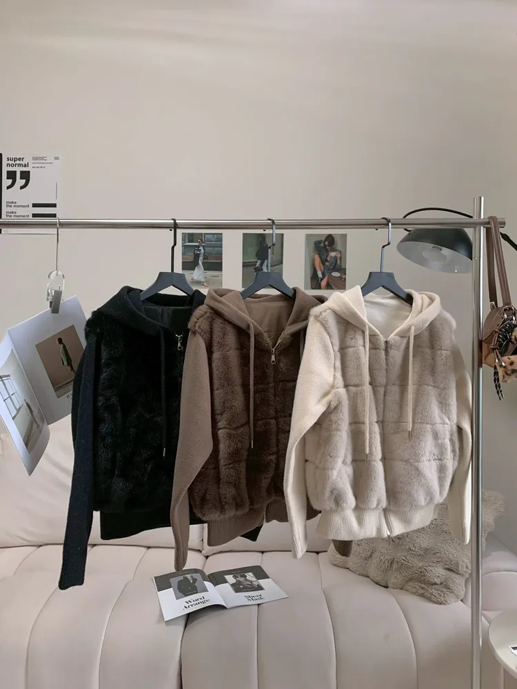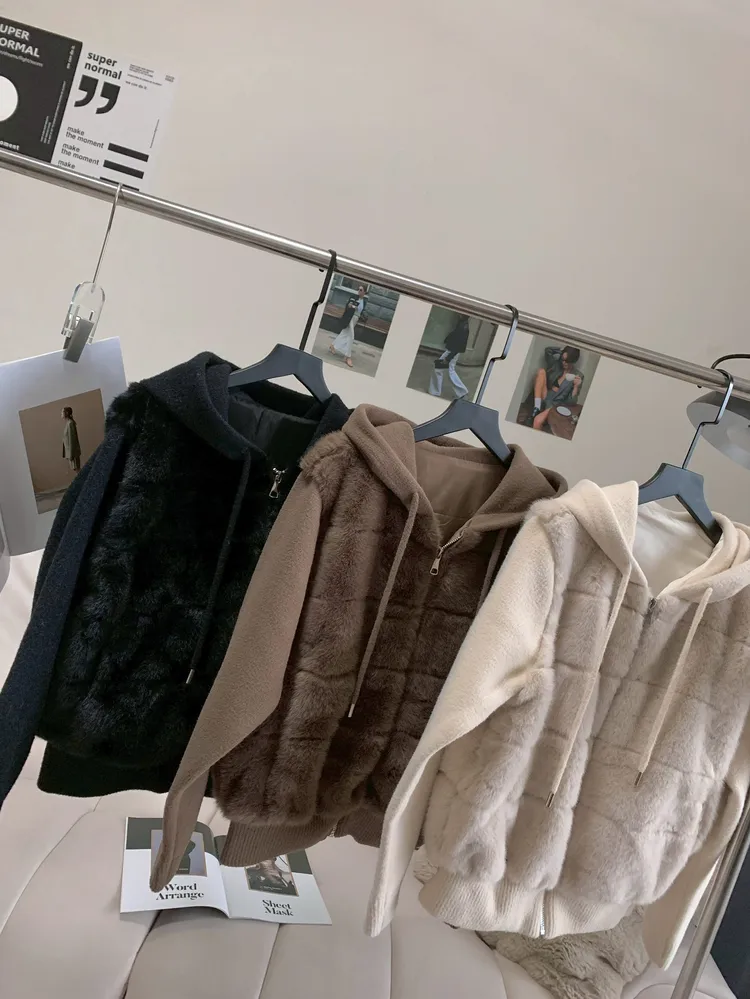 C206連帽毛絨拼接毛呢外套