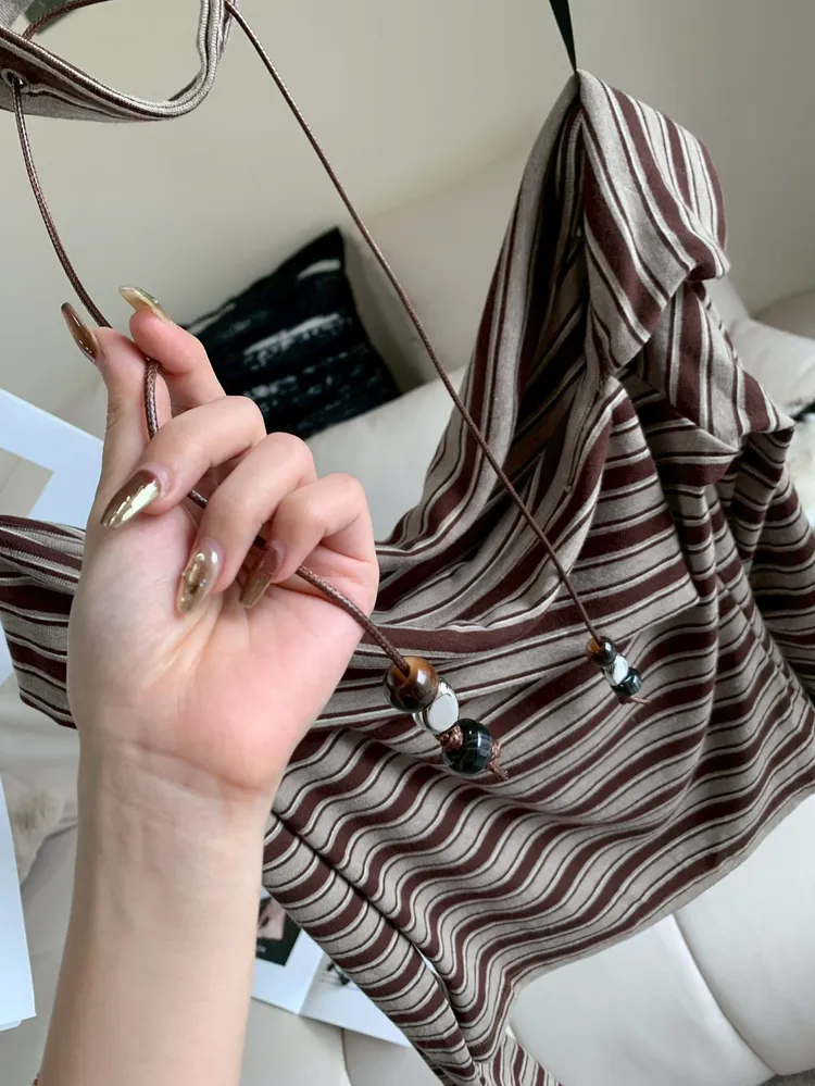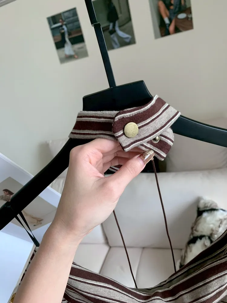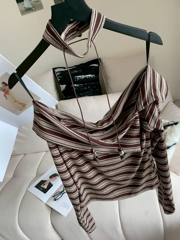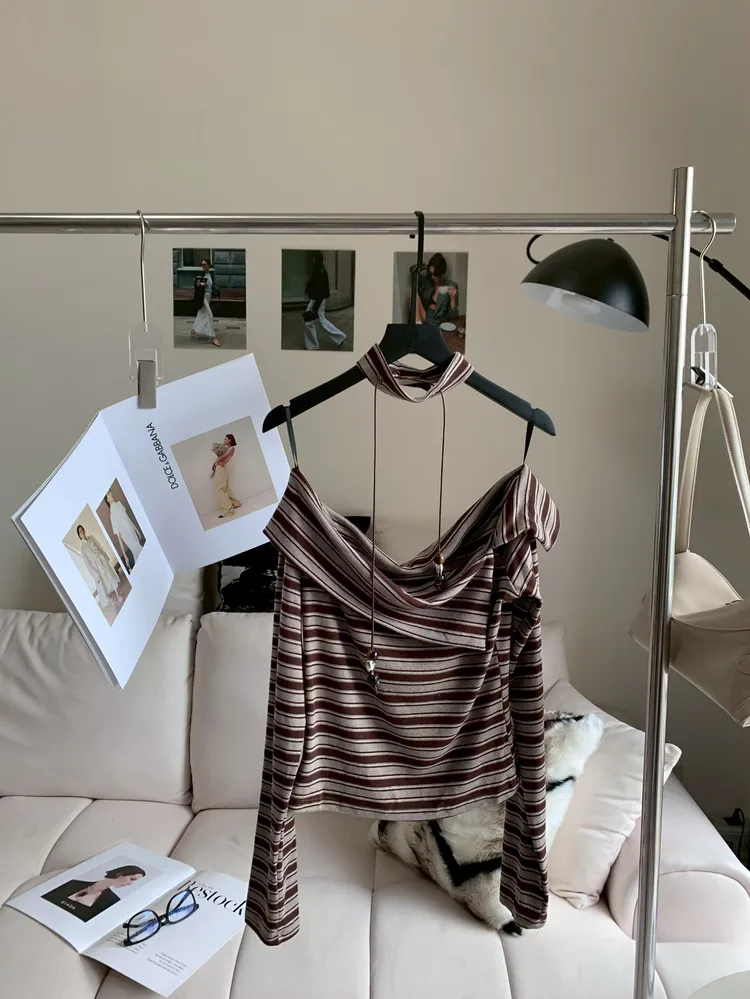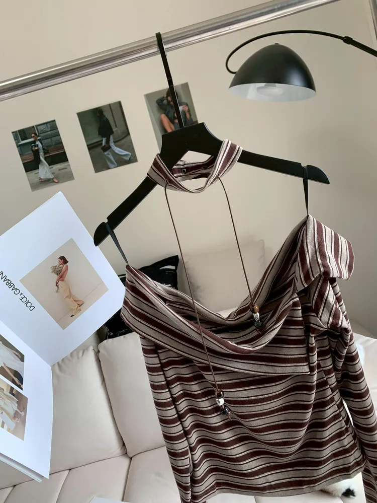 C304圍脖綴飾條紋露肩上衣