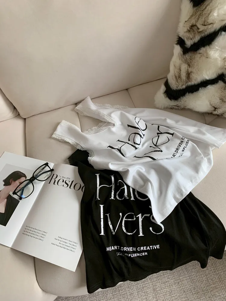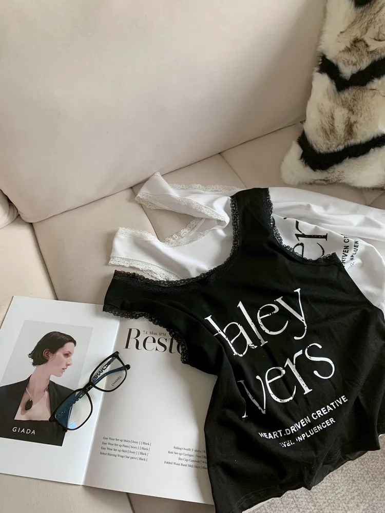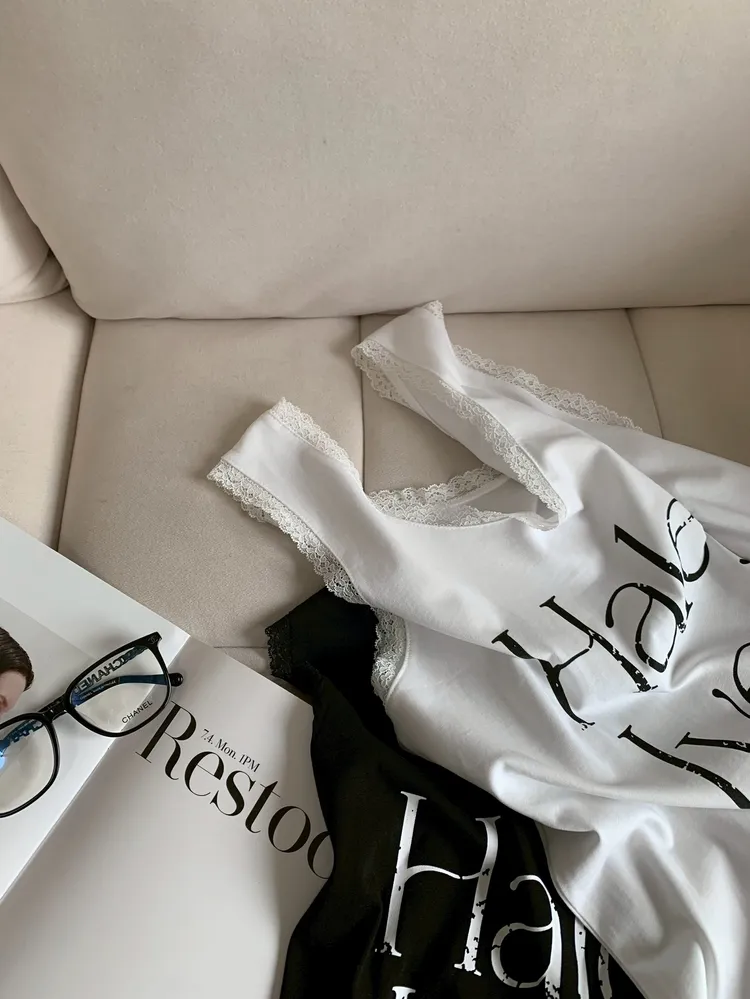 C305字母拼接蕾絲U領背心