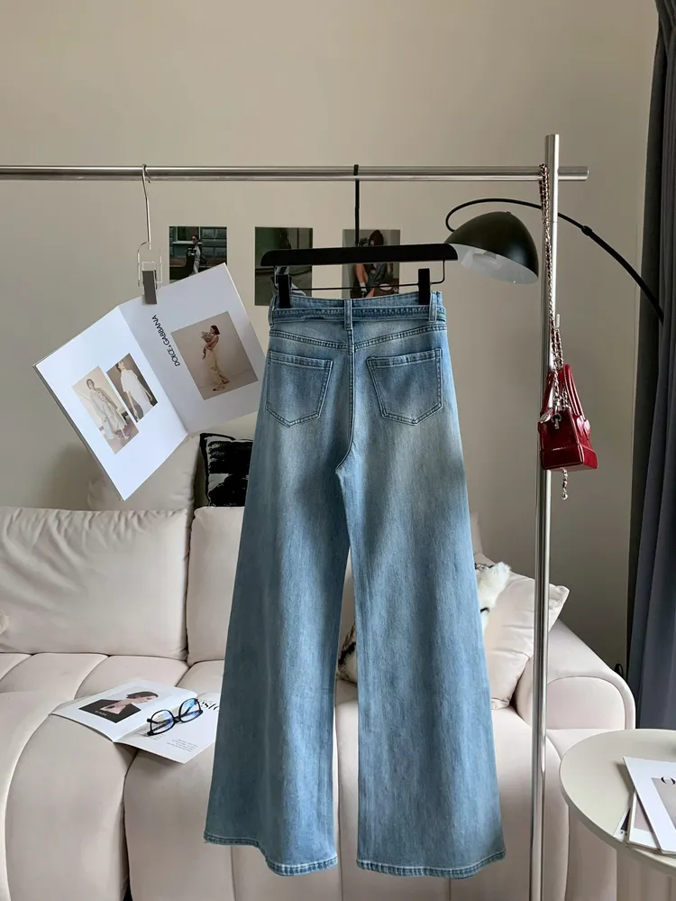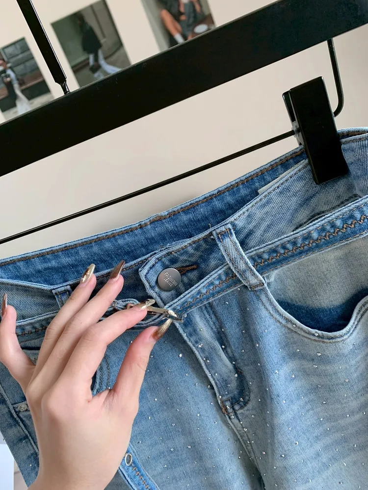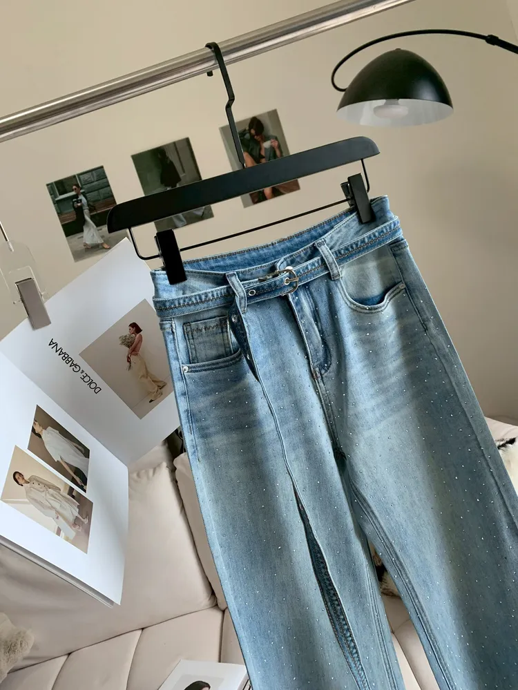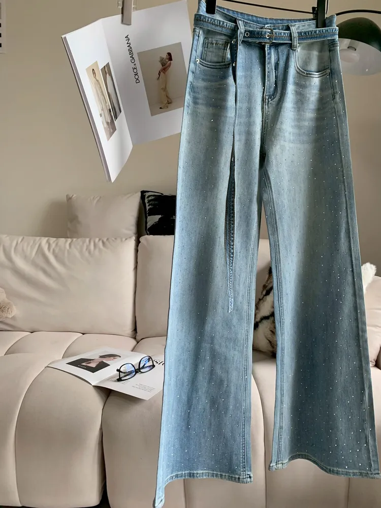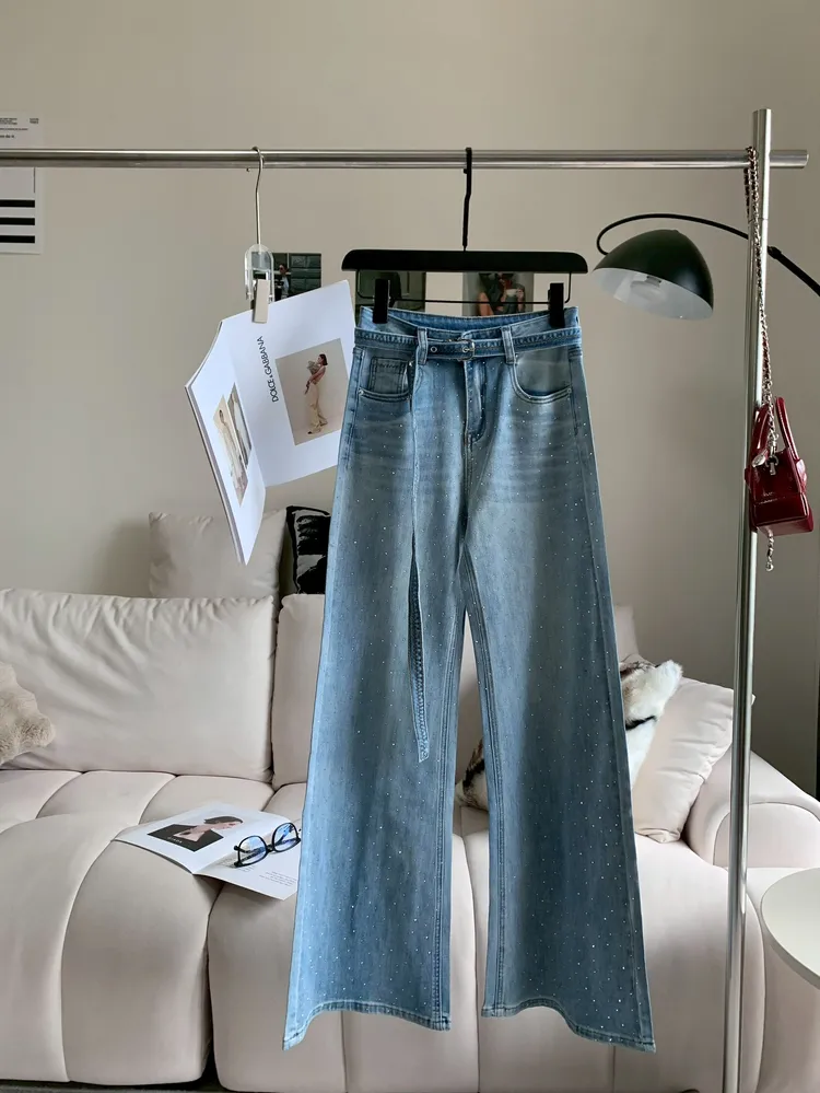 C318燙鑽繫腰直筒微喇牛仔褲