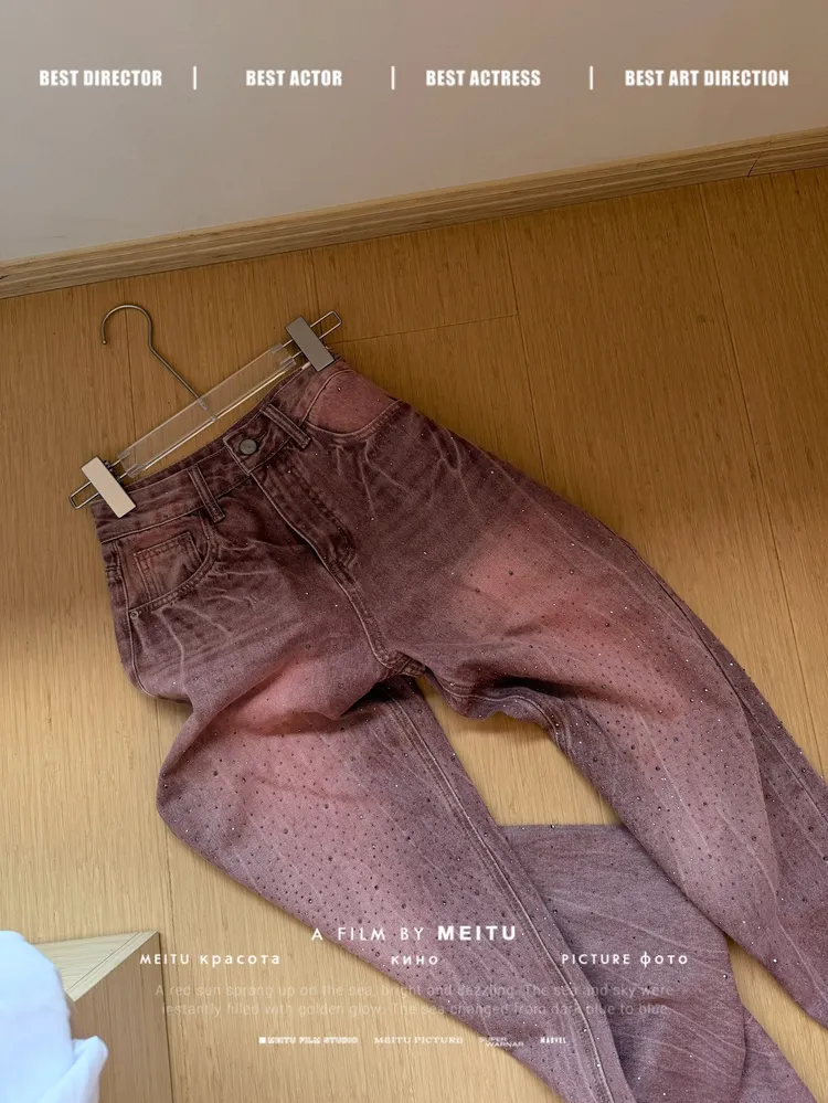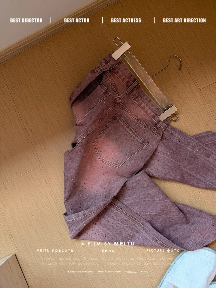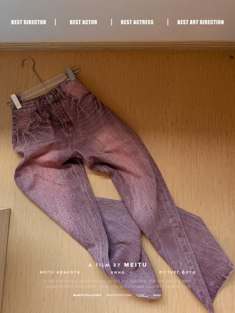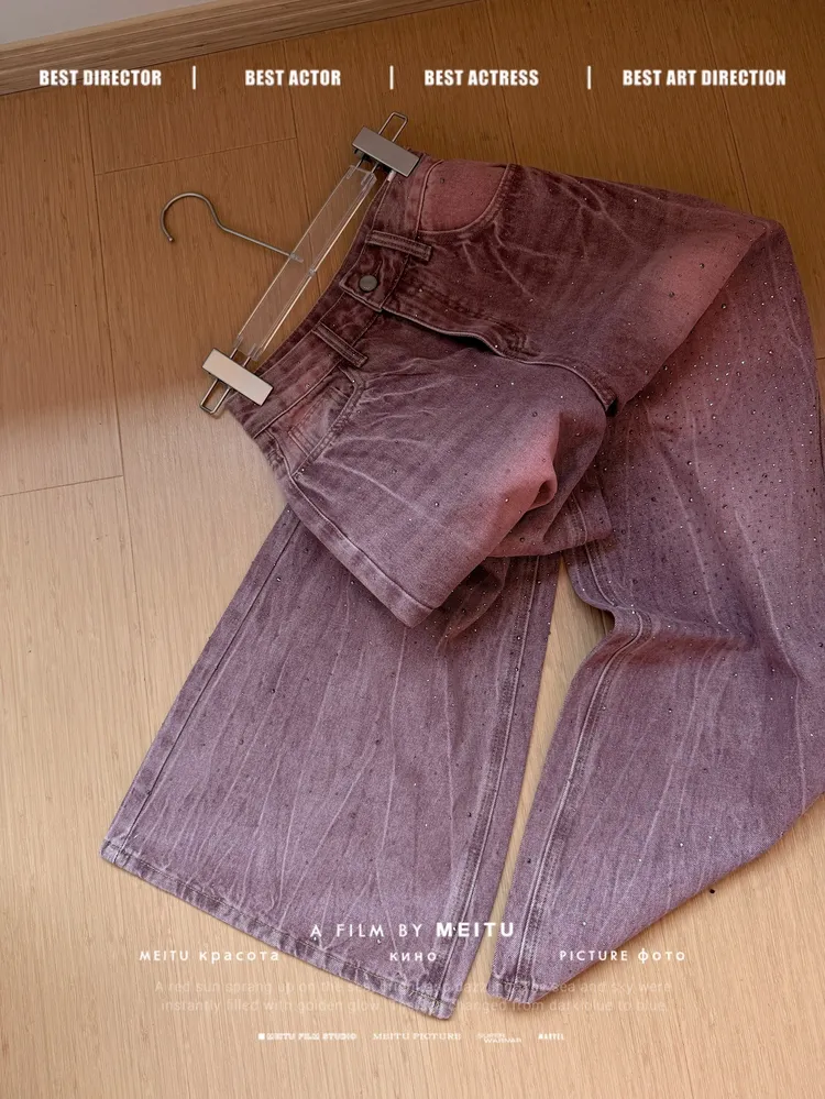 C354莓粉燙鑽刷色牛仔寬褲