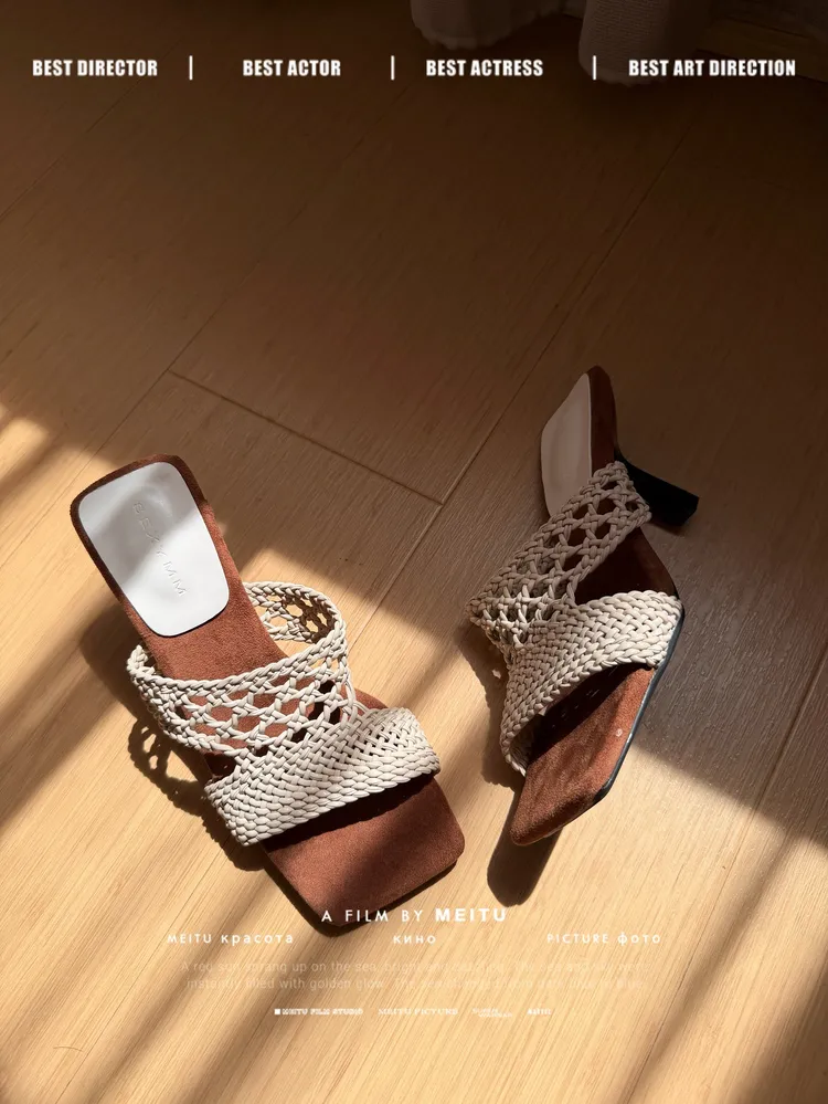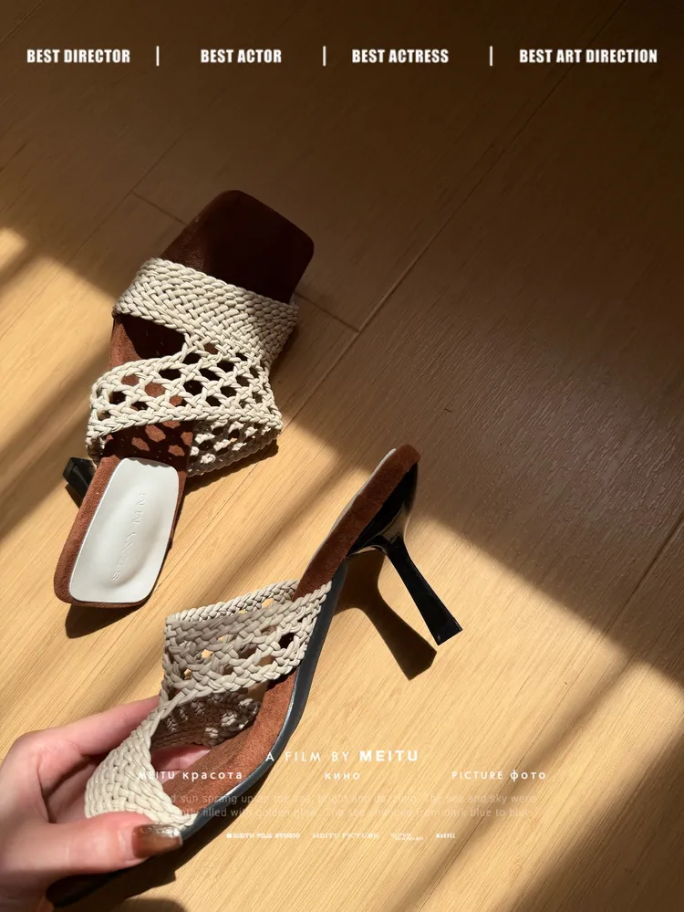 C358米白色編織錐形高跟涼鞋