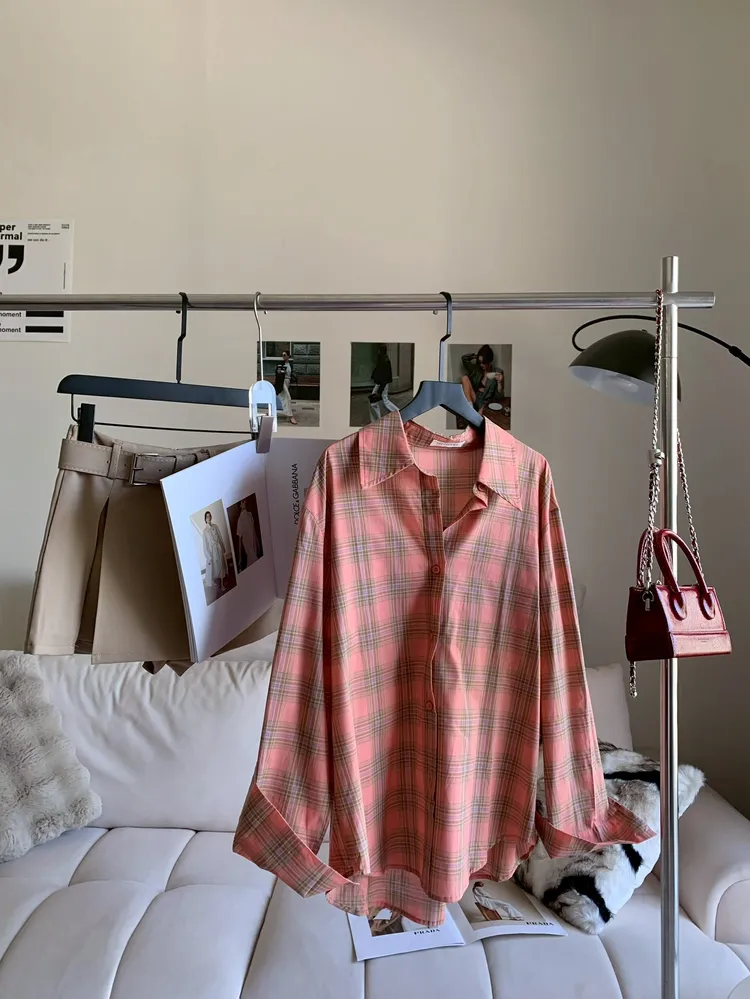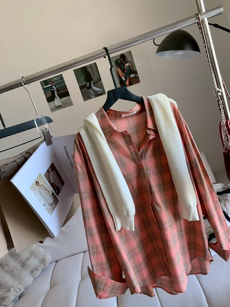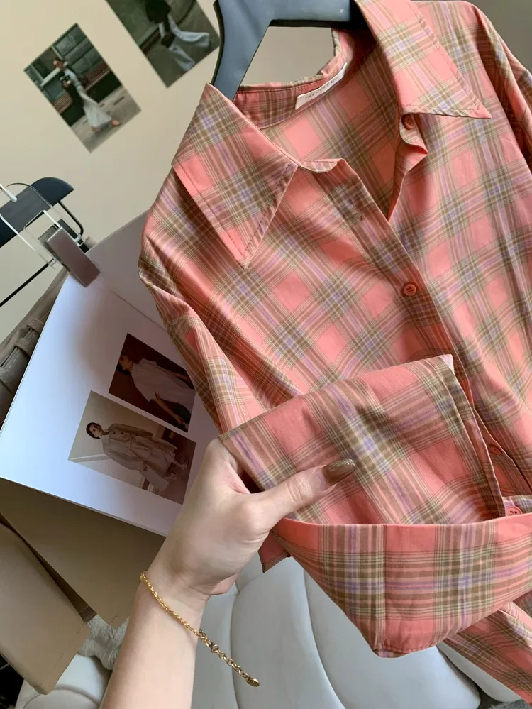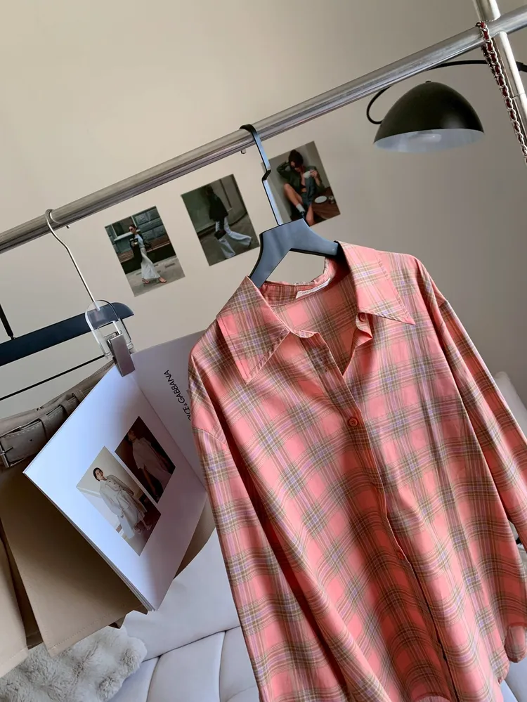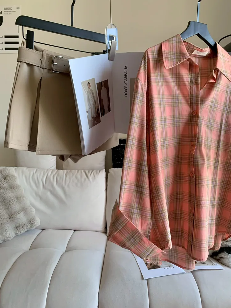 C374春夏清新感橘粉格紋襯衫