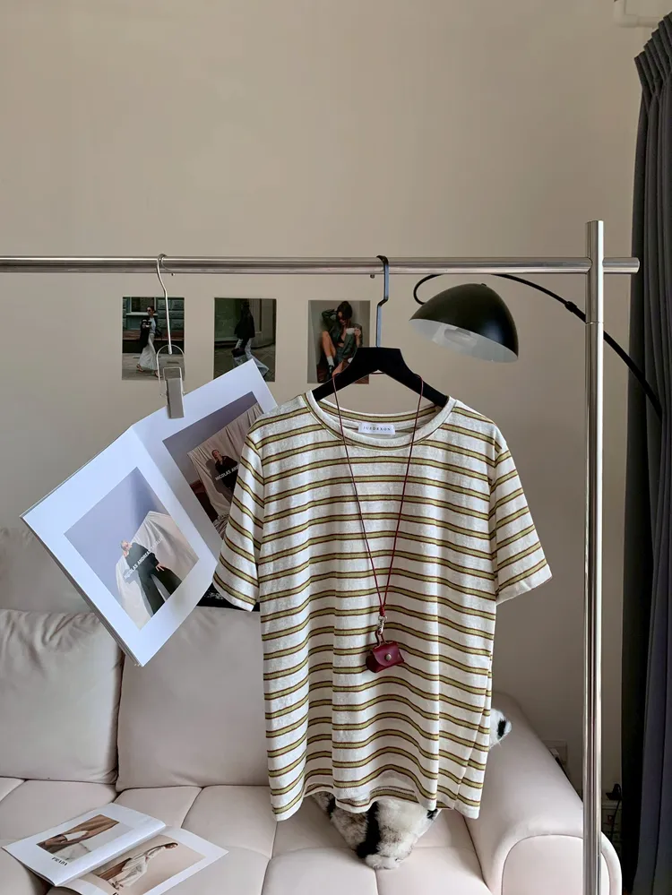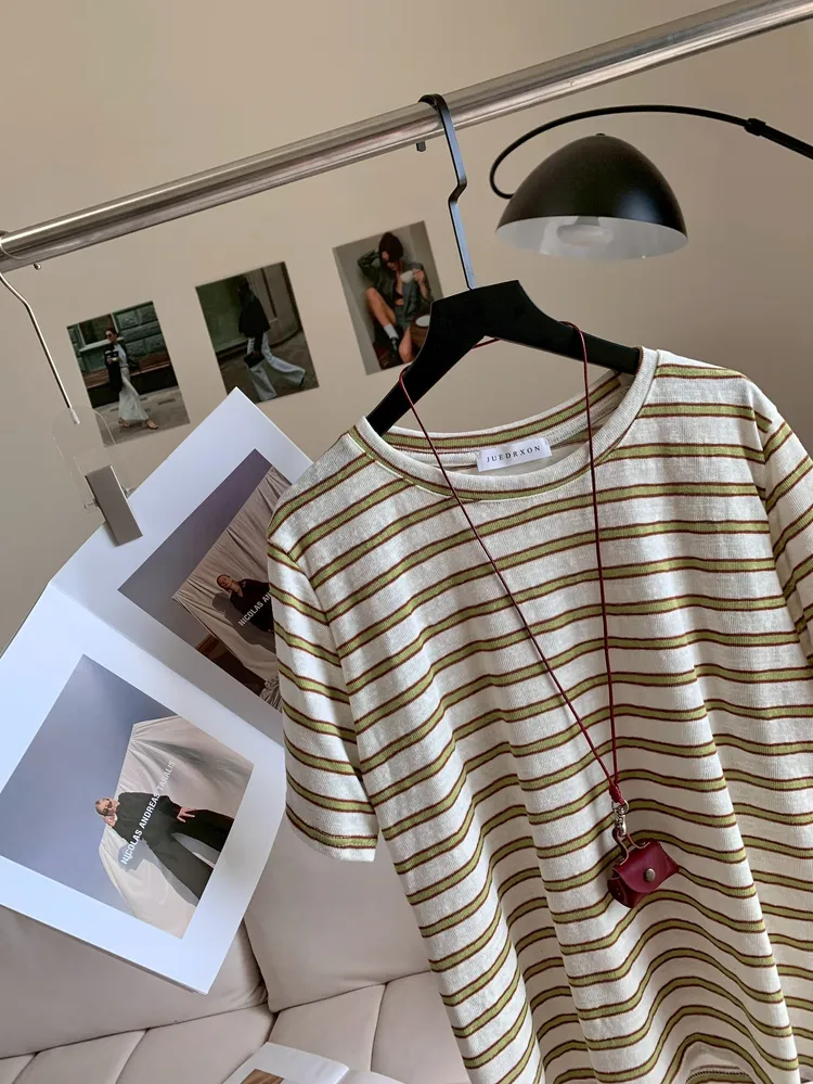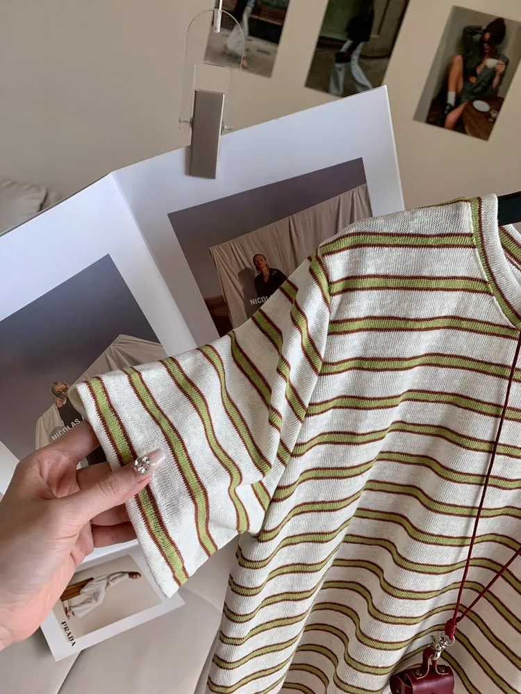 C397牛油果綠條紋撞色上衣