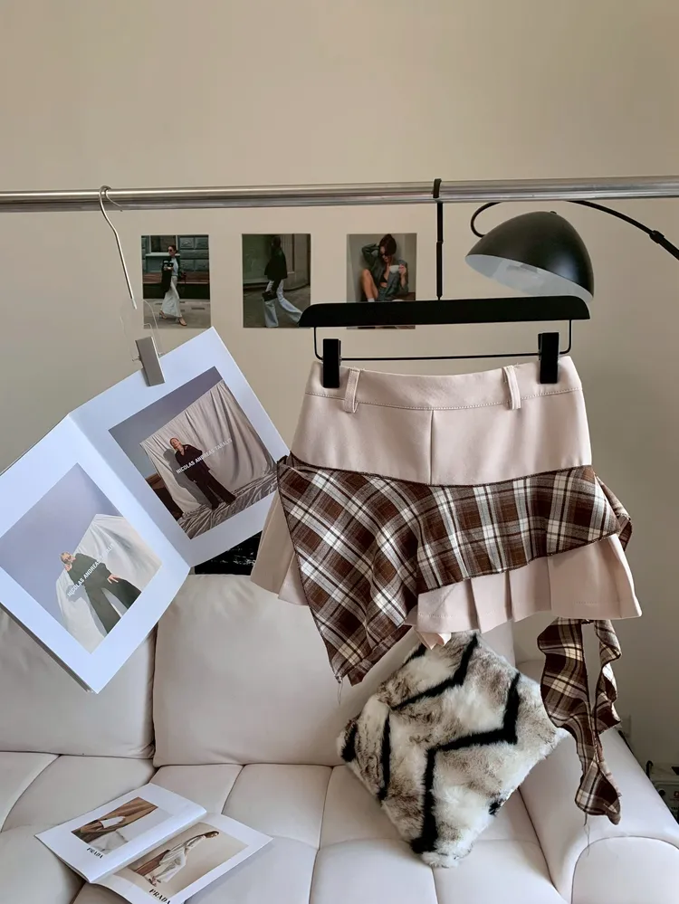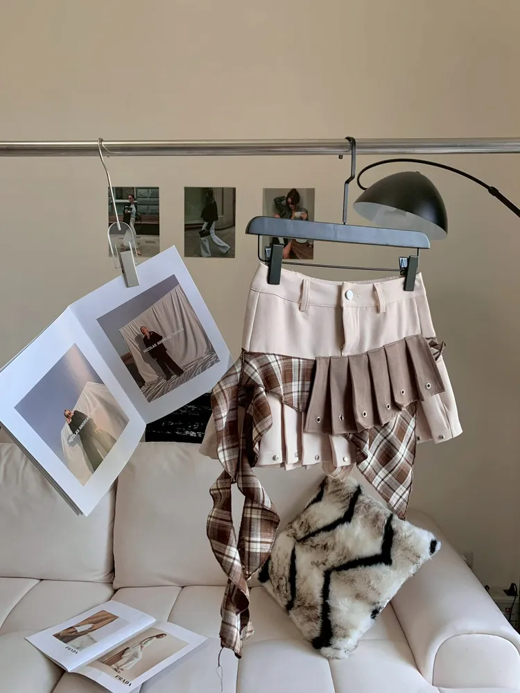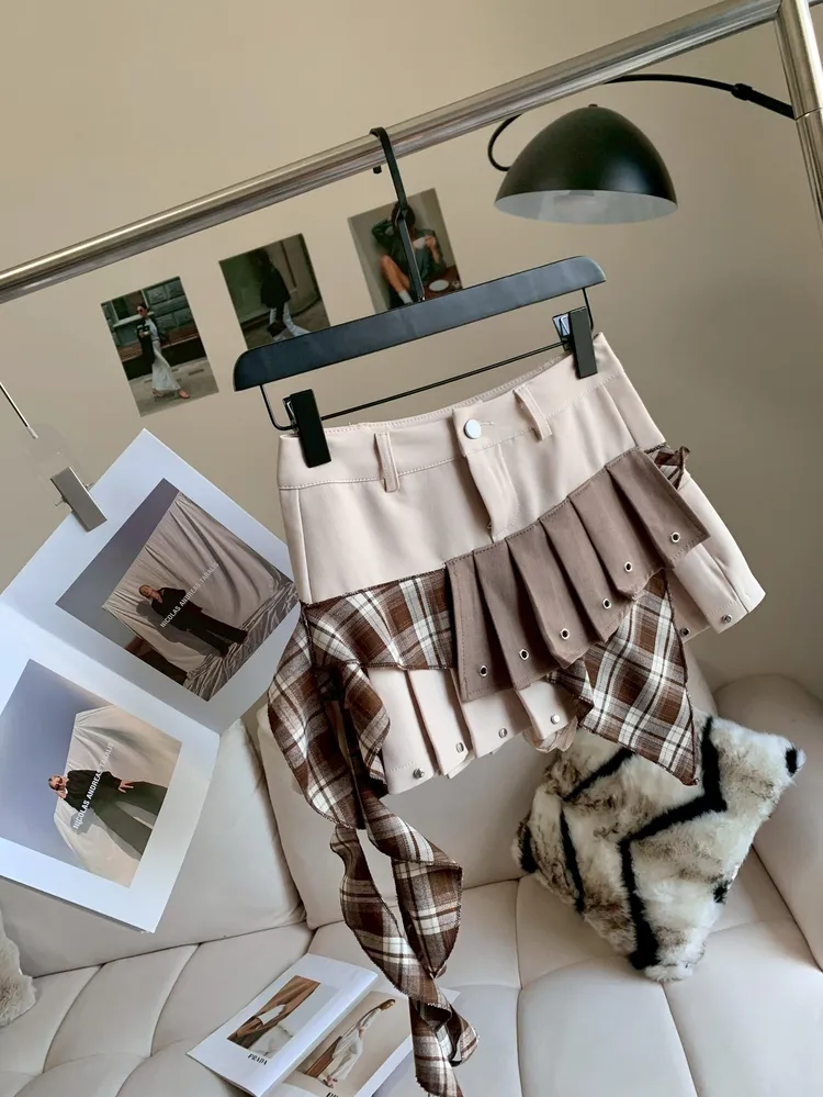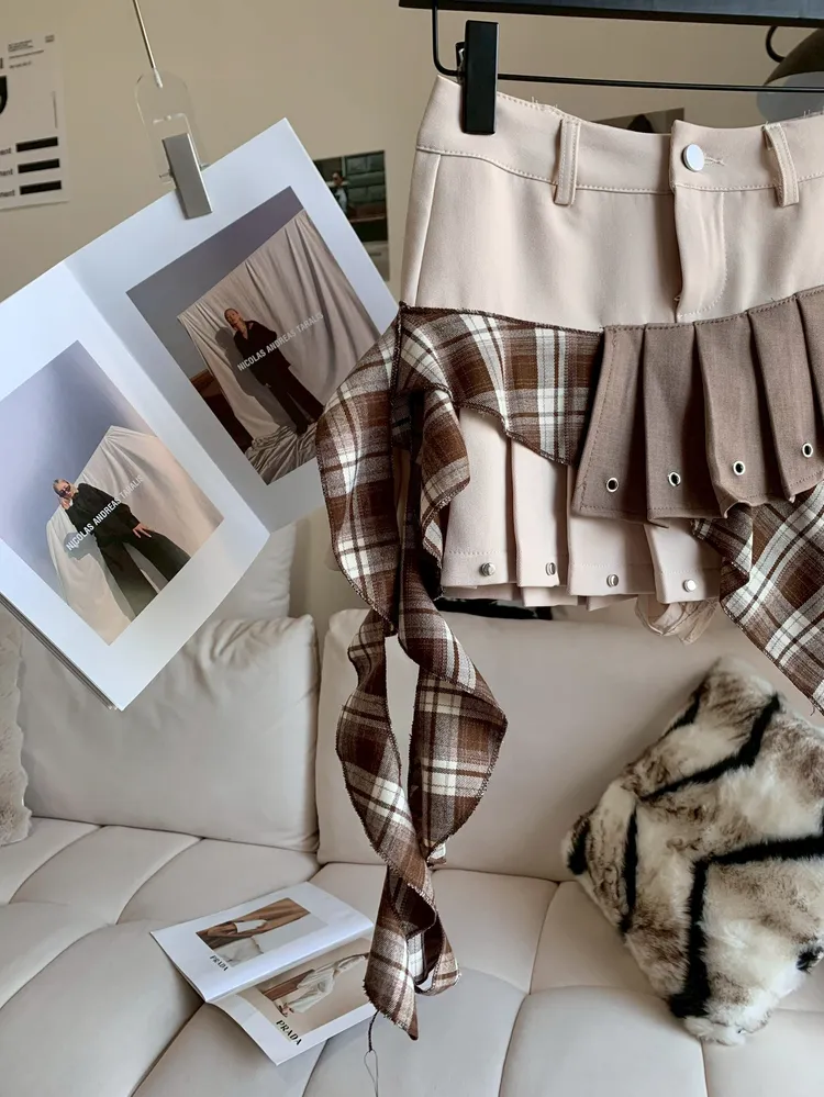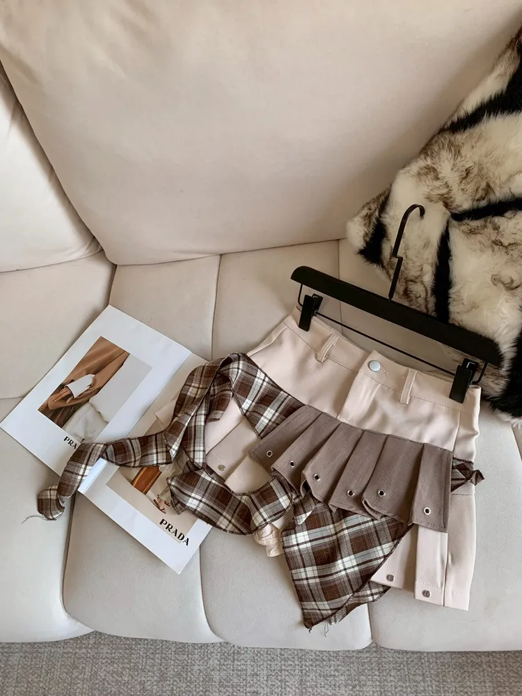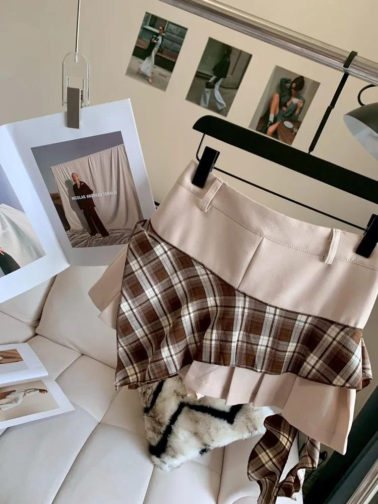 C401杏棕拼接設計感短褲裙