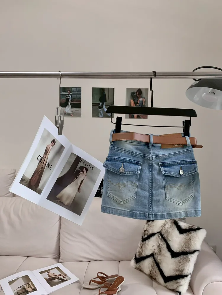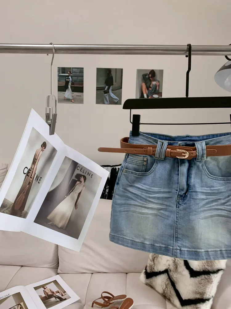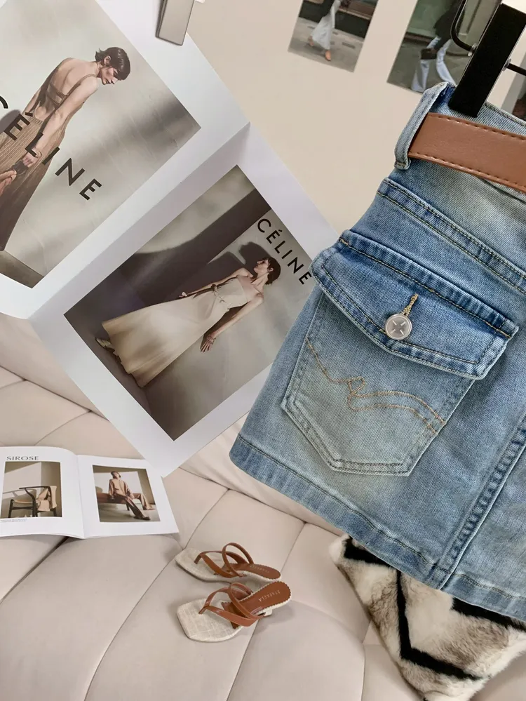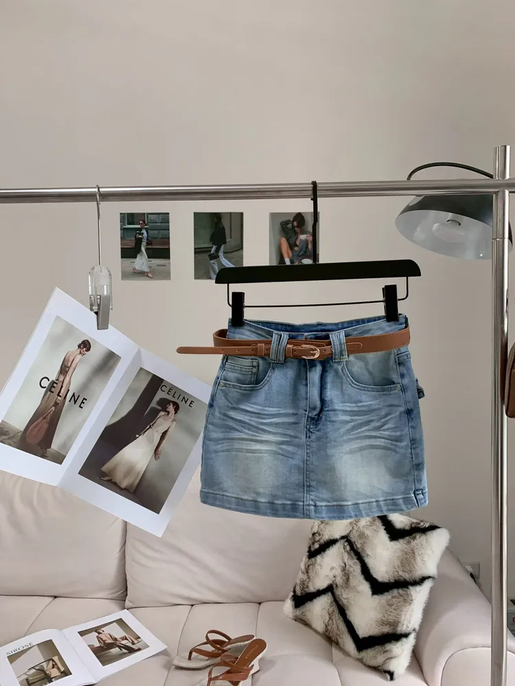 C461棕色腰帶彈性牛仔短裙