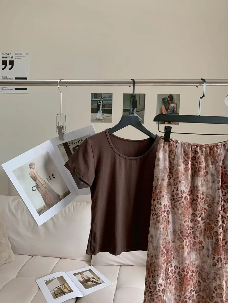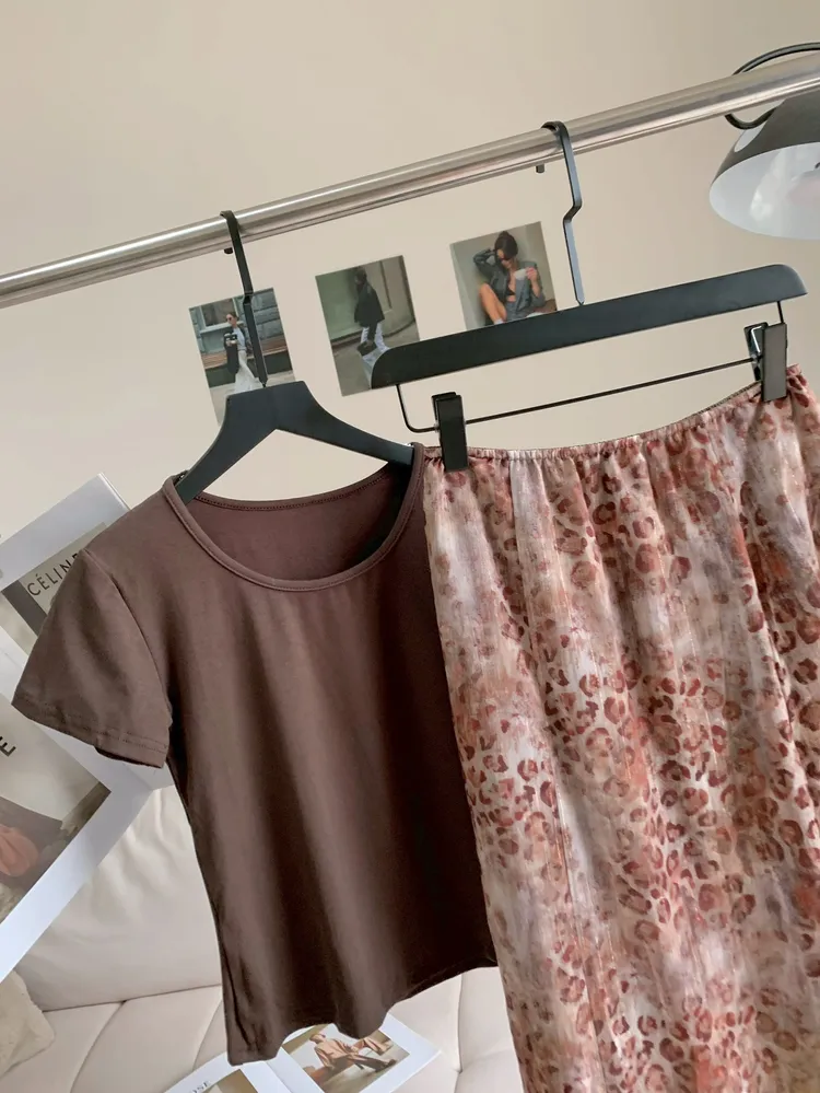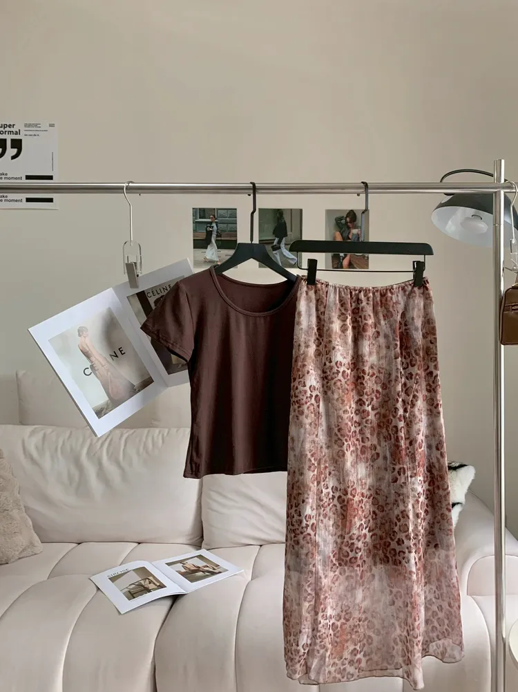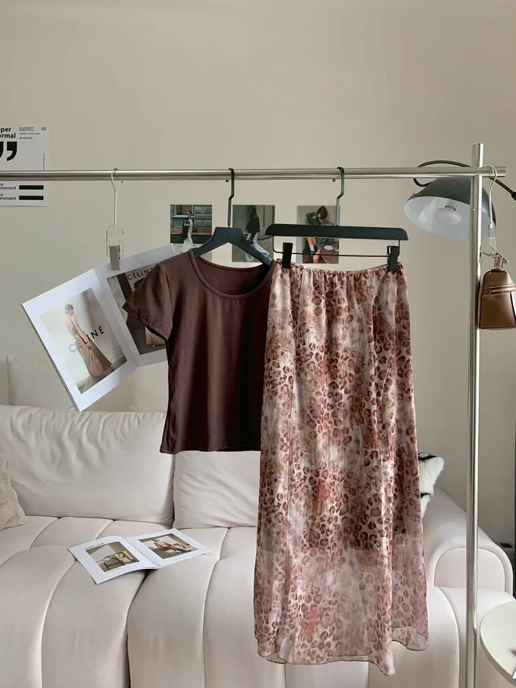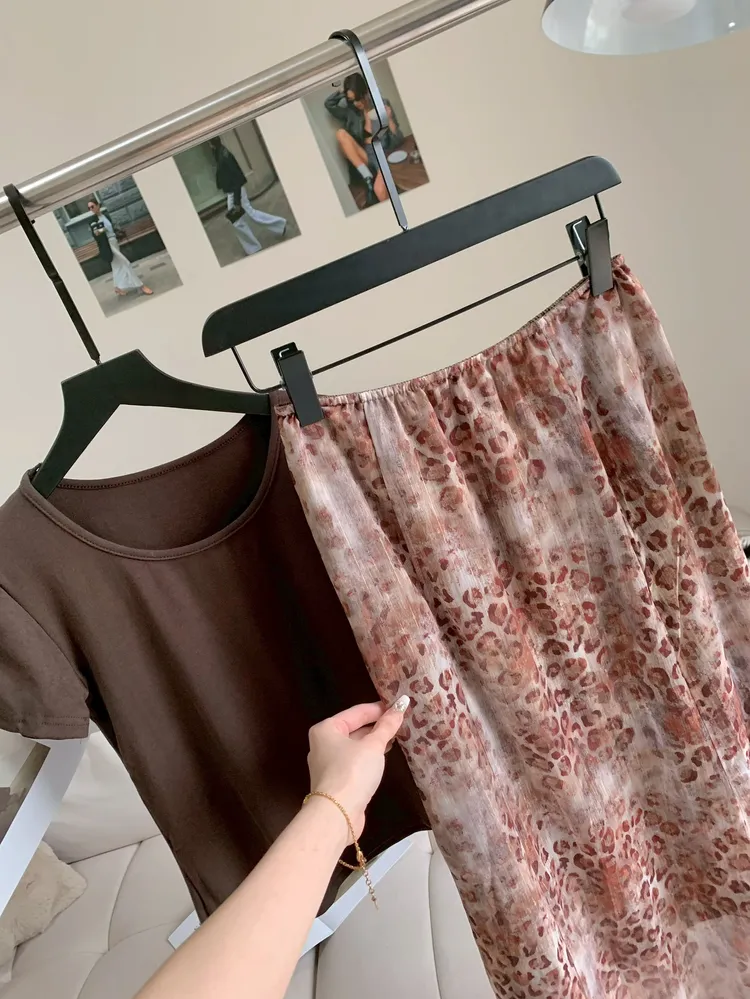 C472溫柔咖系豹紋飄逸長裙套裝