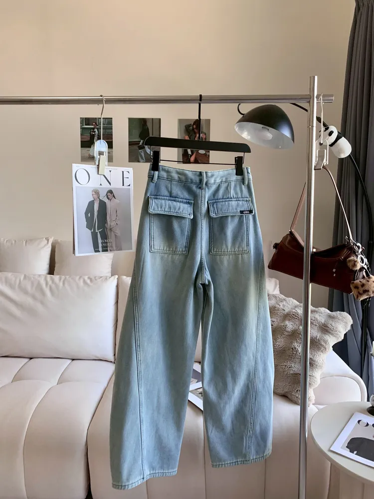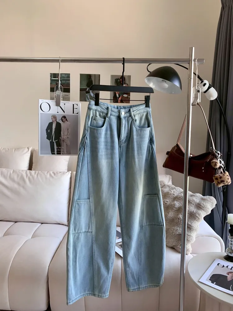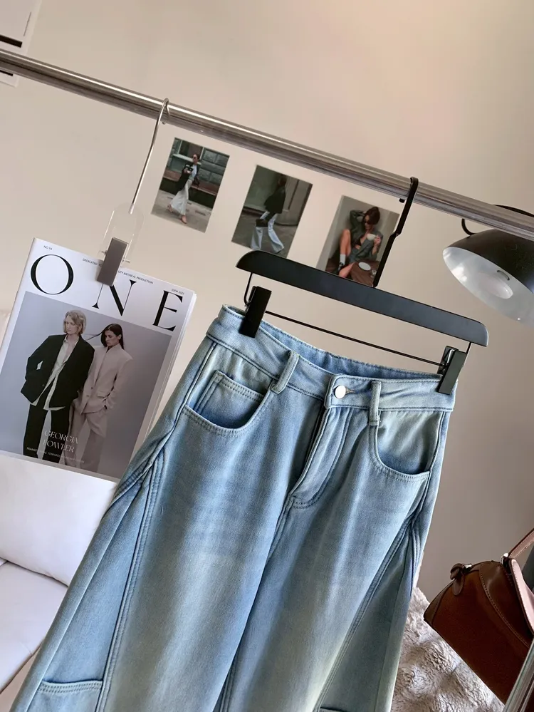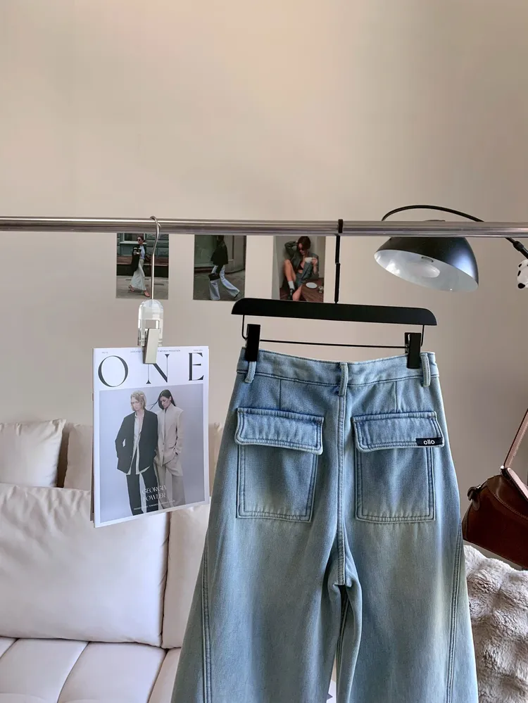 T639線條口袋加絨牛仔寬褲