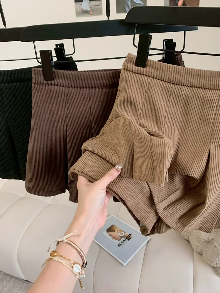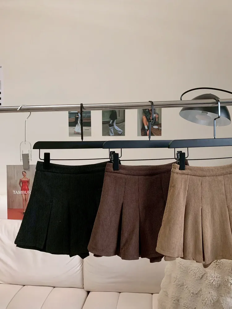 T642燈心絨高腰壓褶短裙