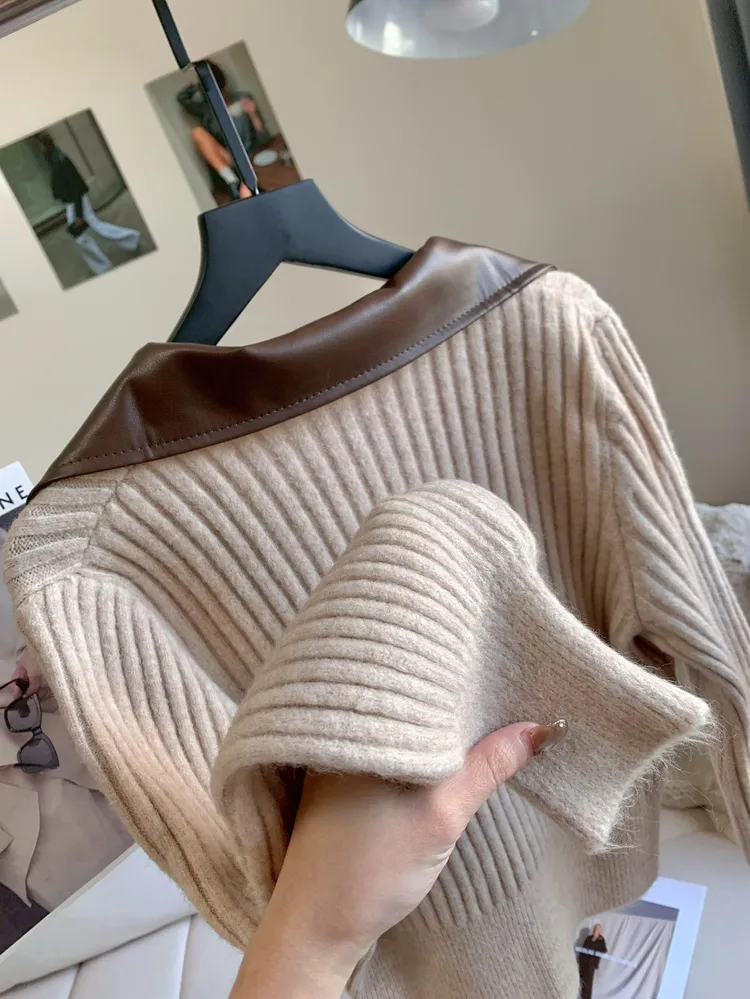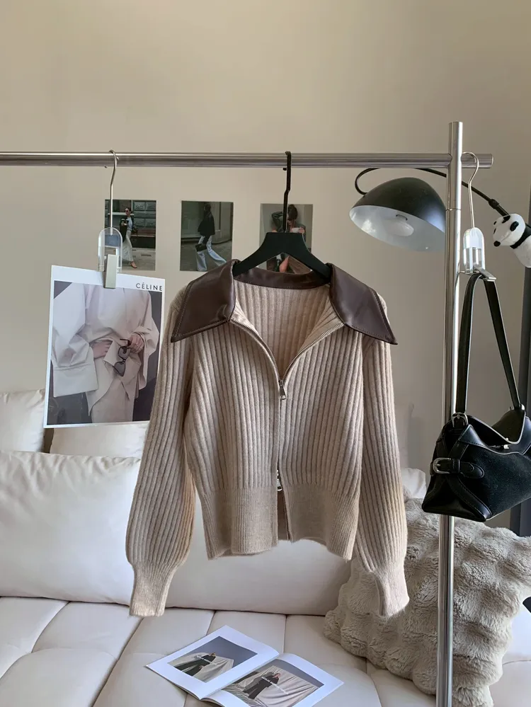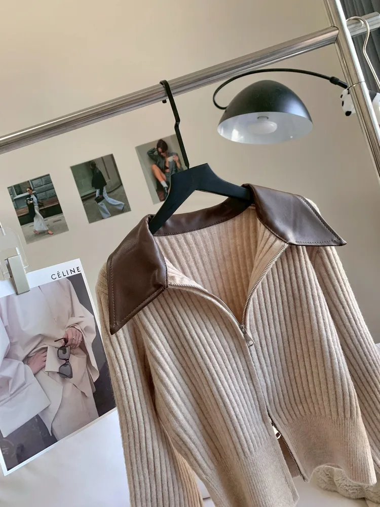 T666拼接皮領坑條拉鍊外套