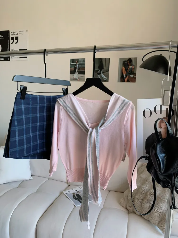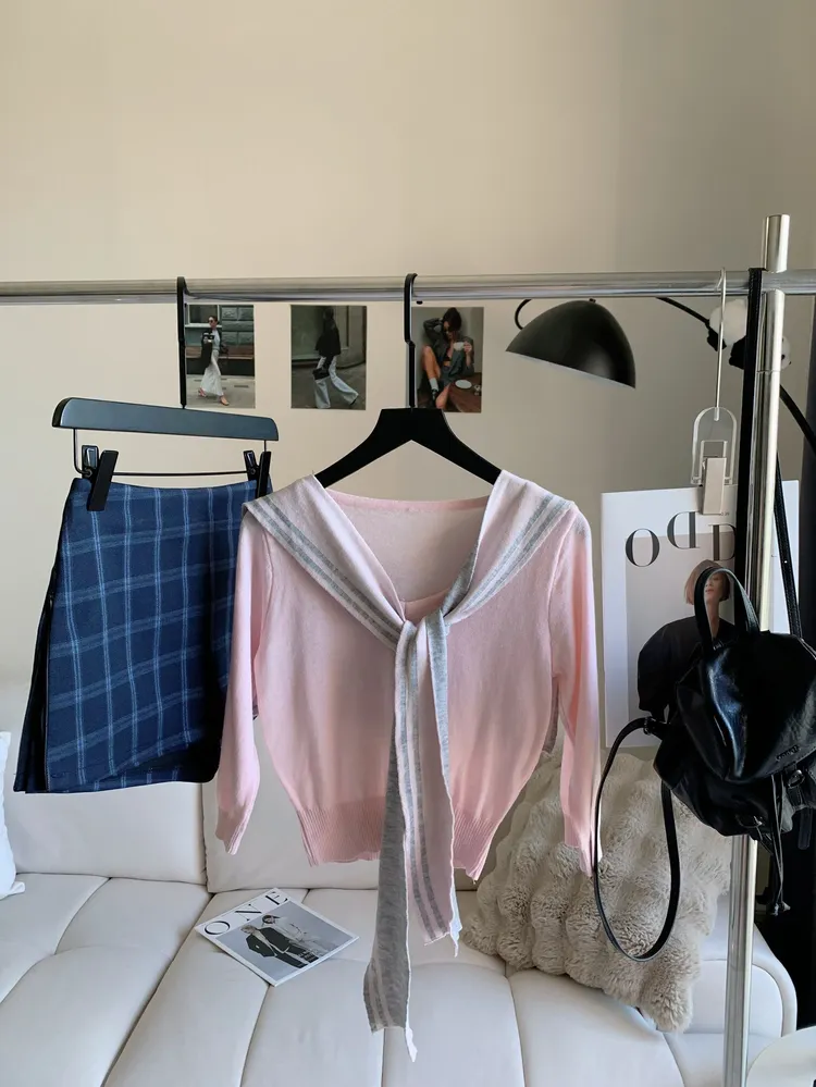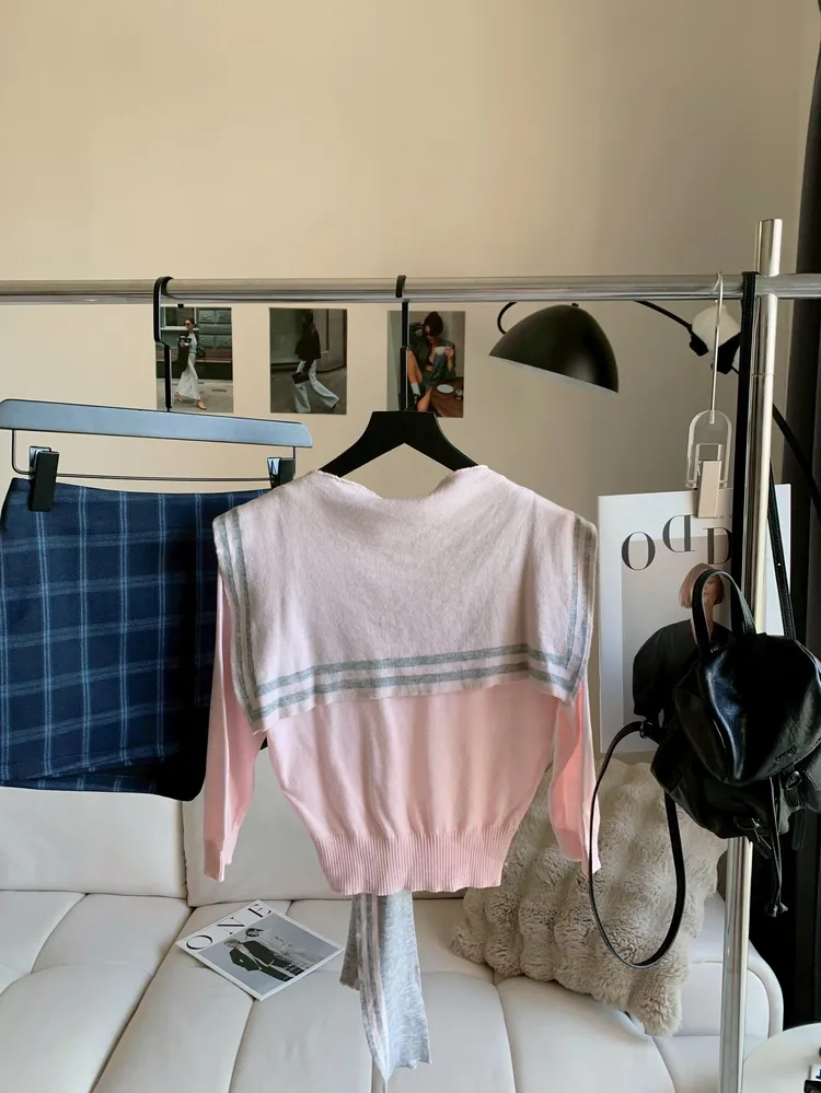 T851披肩V領粉灰兩件上衣