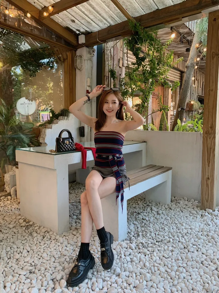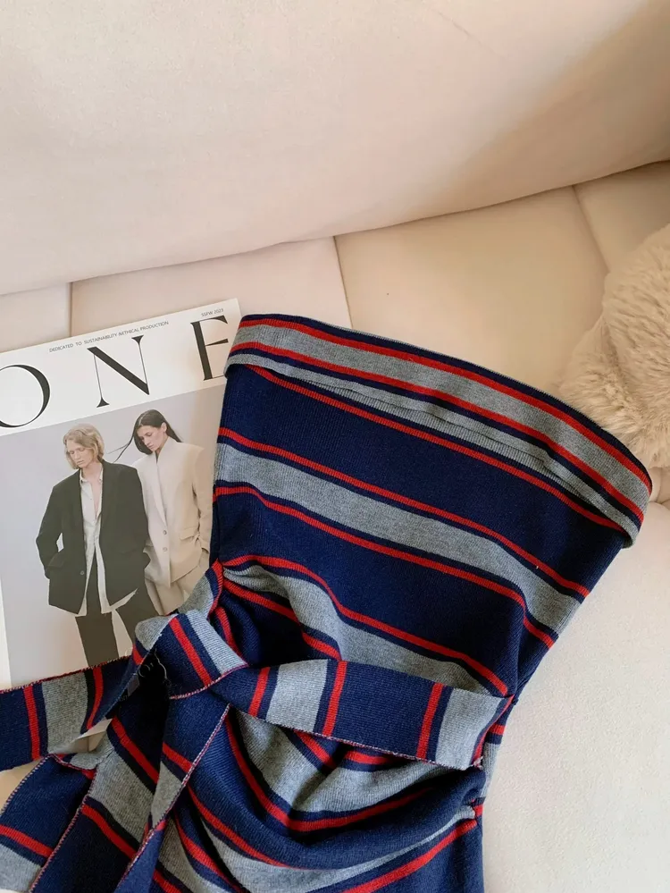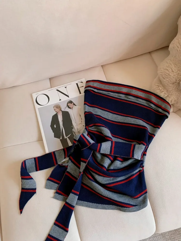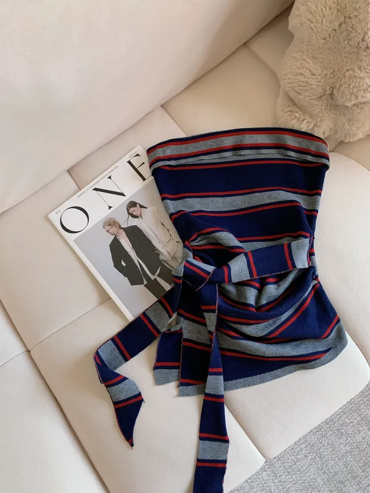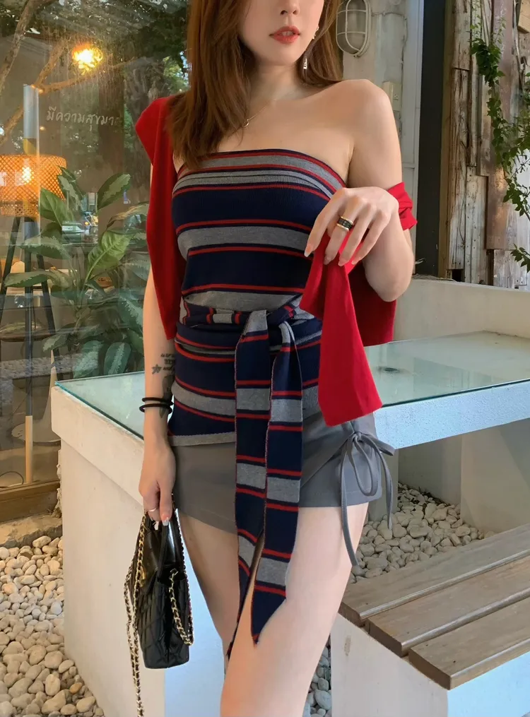 T859紅藍線條針織綁腰上衣